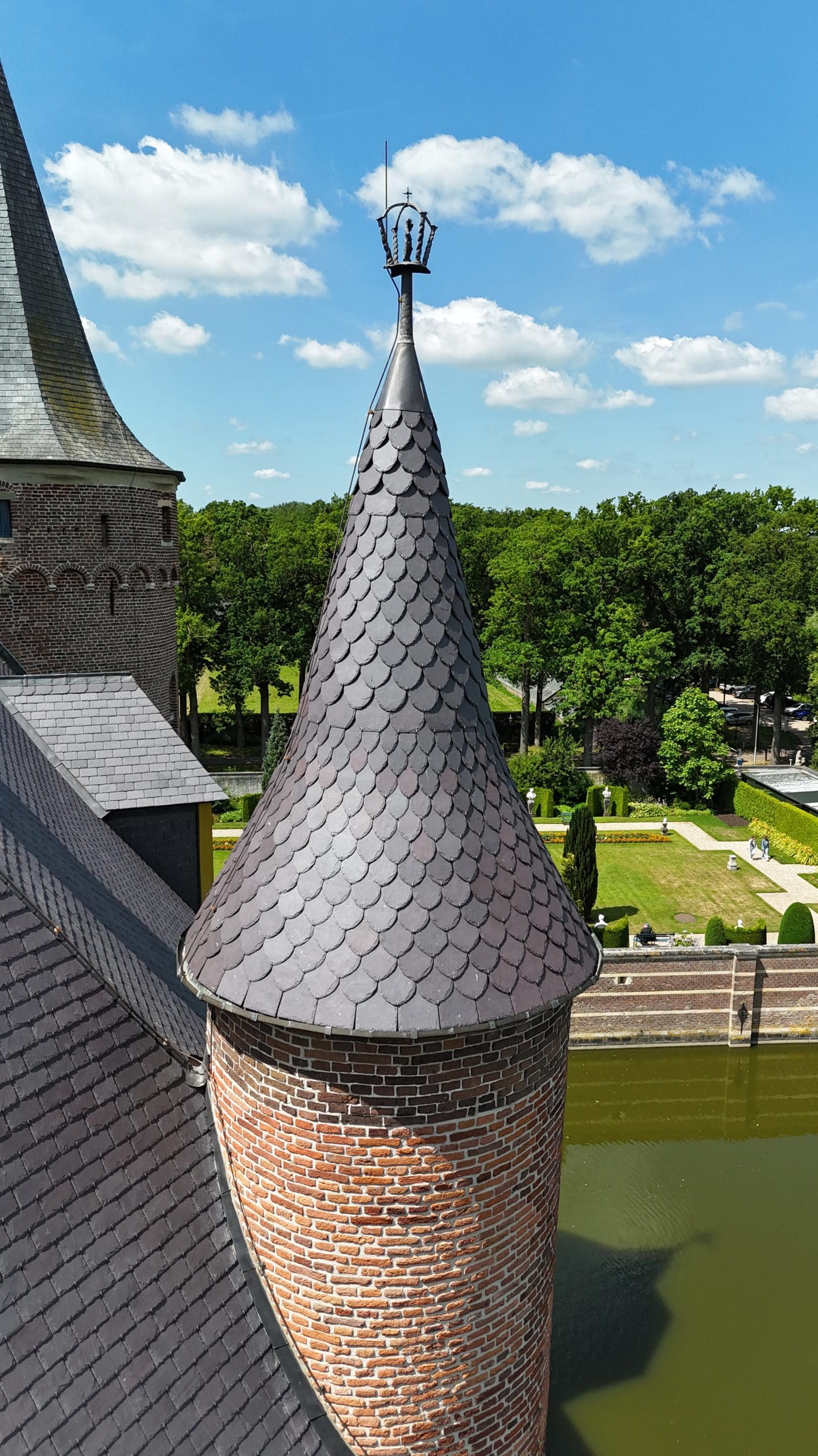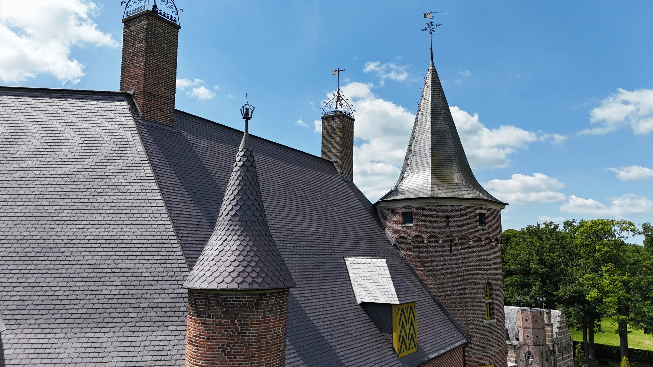 Restaureren van de leien daken, herstel van de historische plafonds en na-isolatie van de zolder.